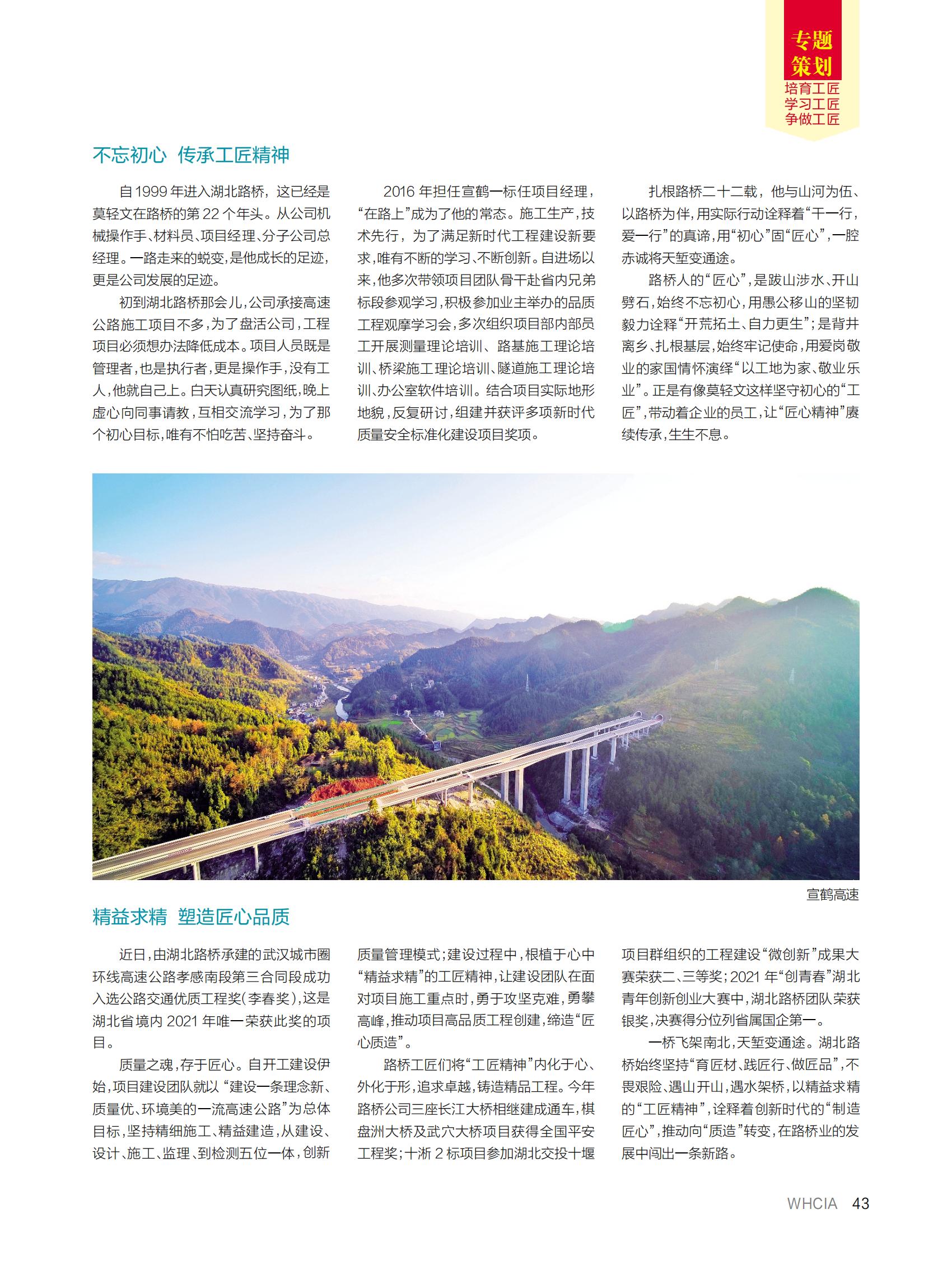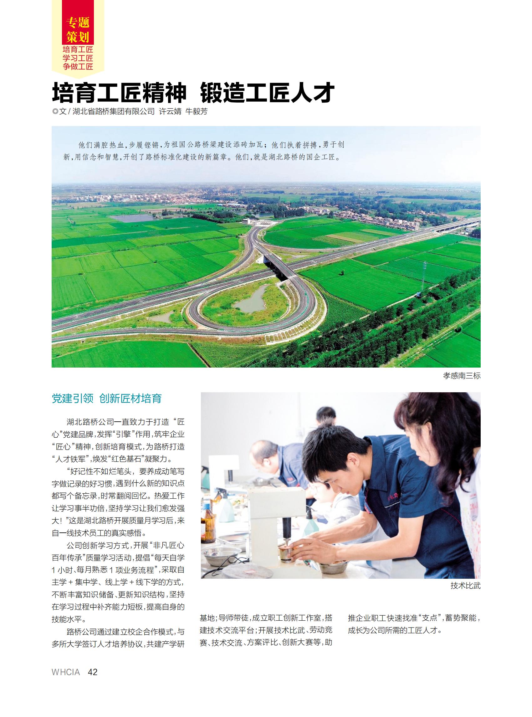 近日,湖北路橋撰寫的《培育工匠精神 鍛造工匠人才》一文,登上武漢建筑業(yè)協會主辦的《武漢建筑業(yè)》雜志“工匠精神”專題策劃版,以下為全文: