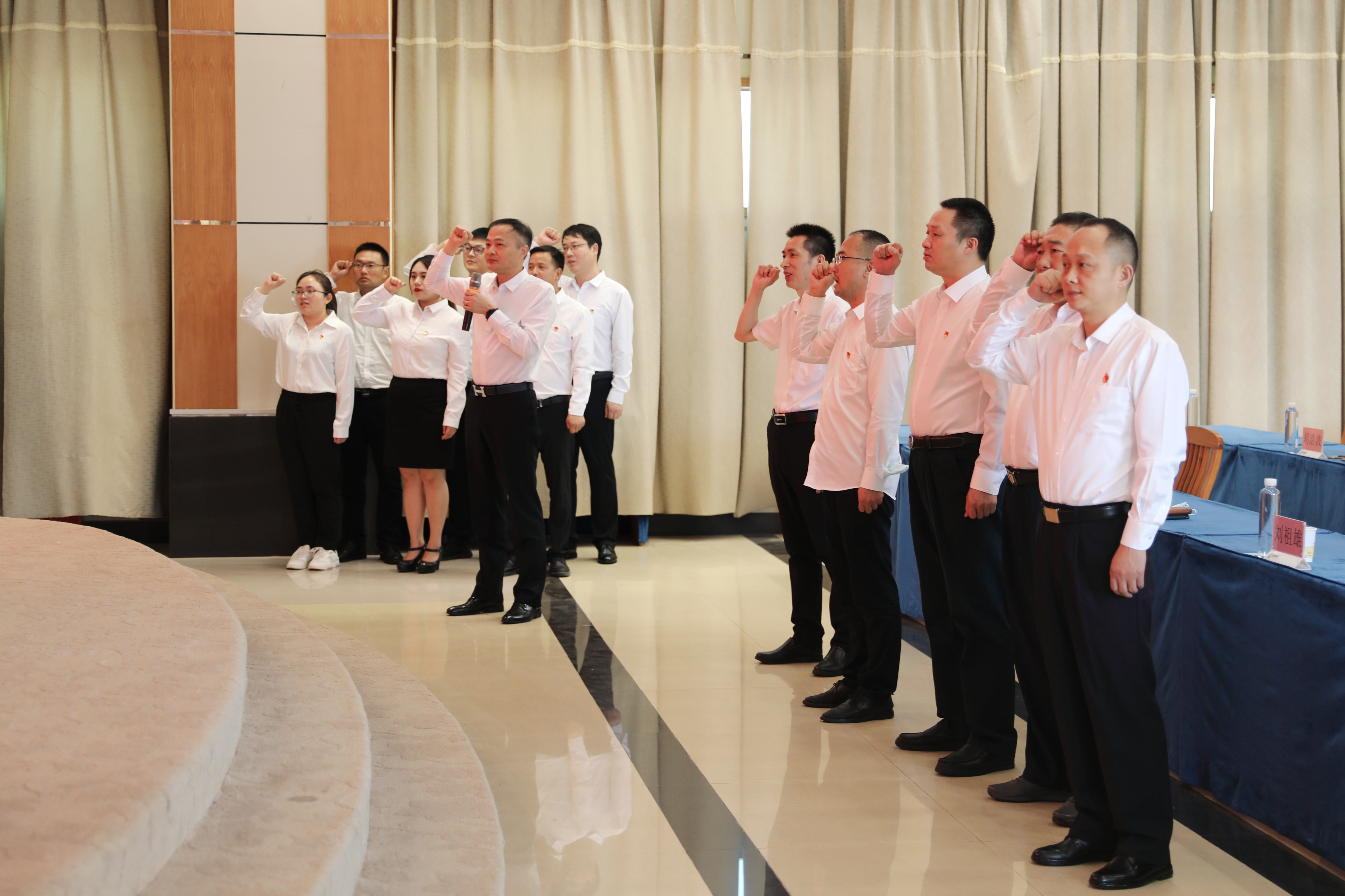 在肅穆莊嚴的氣氛中,建投集團、湖北路橋黨委委員、副總經理周望虎帶領新黨員代表莊嚴宣誓,會場全體黨員重溫入黨誓詞。諍諍誓言,擲地有聲,表達了建投集團、湖北路橋黨員干部對黨的崇高信仰和堅定信念。