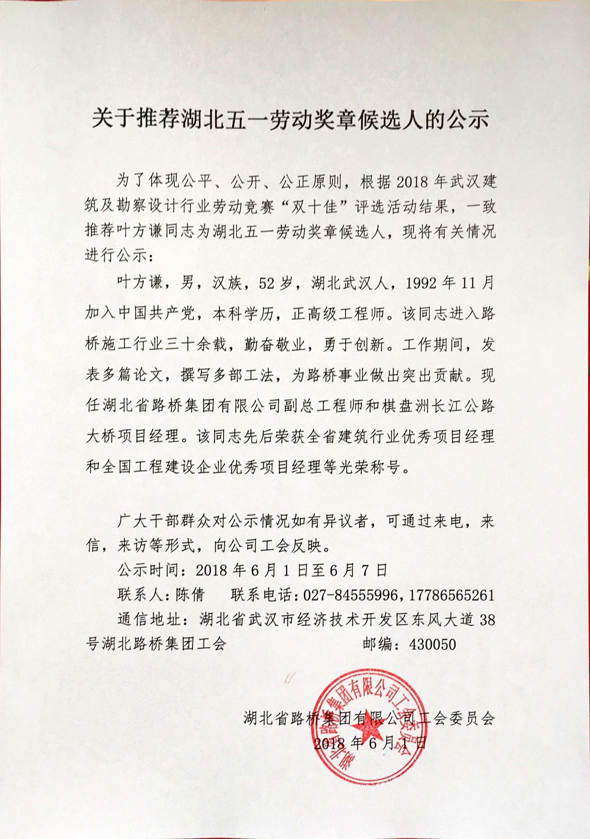 湖北省路橋集團有限公司擬推薦省政府國資委系統2017年度”五四紅旗團委(團支部)“等獎項名單公示