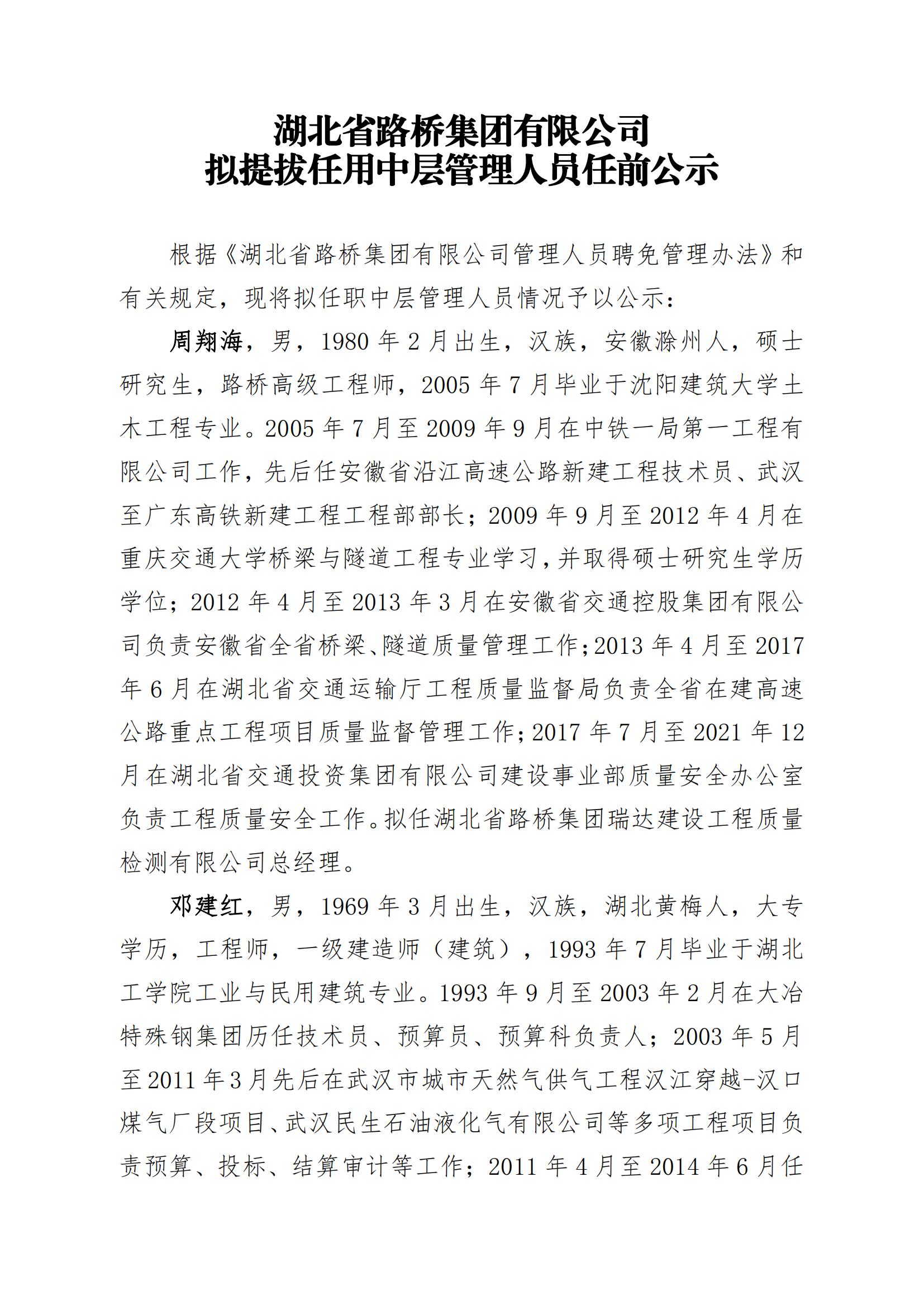 湖北省路橋集團(tuán)有限公司擬提拔任用中層管理人員任前公示