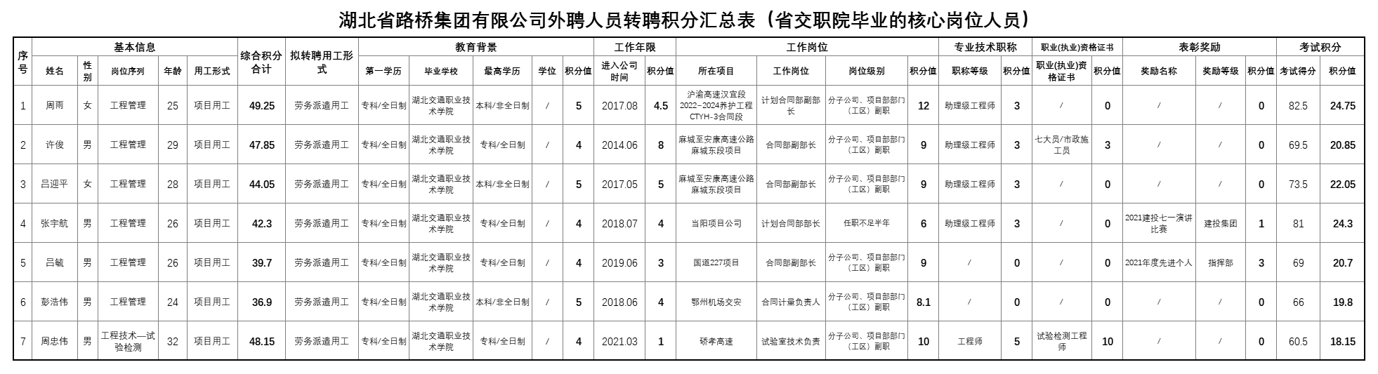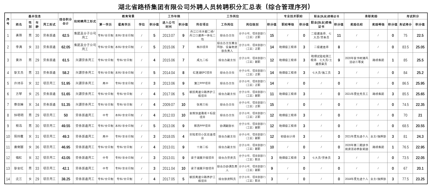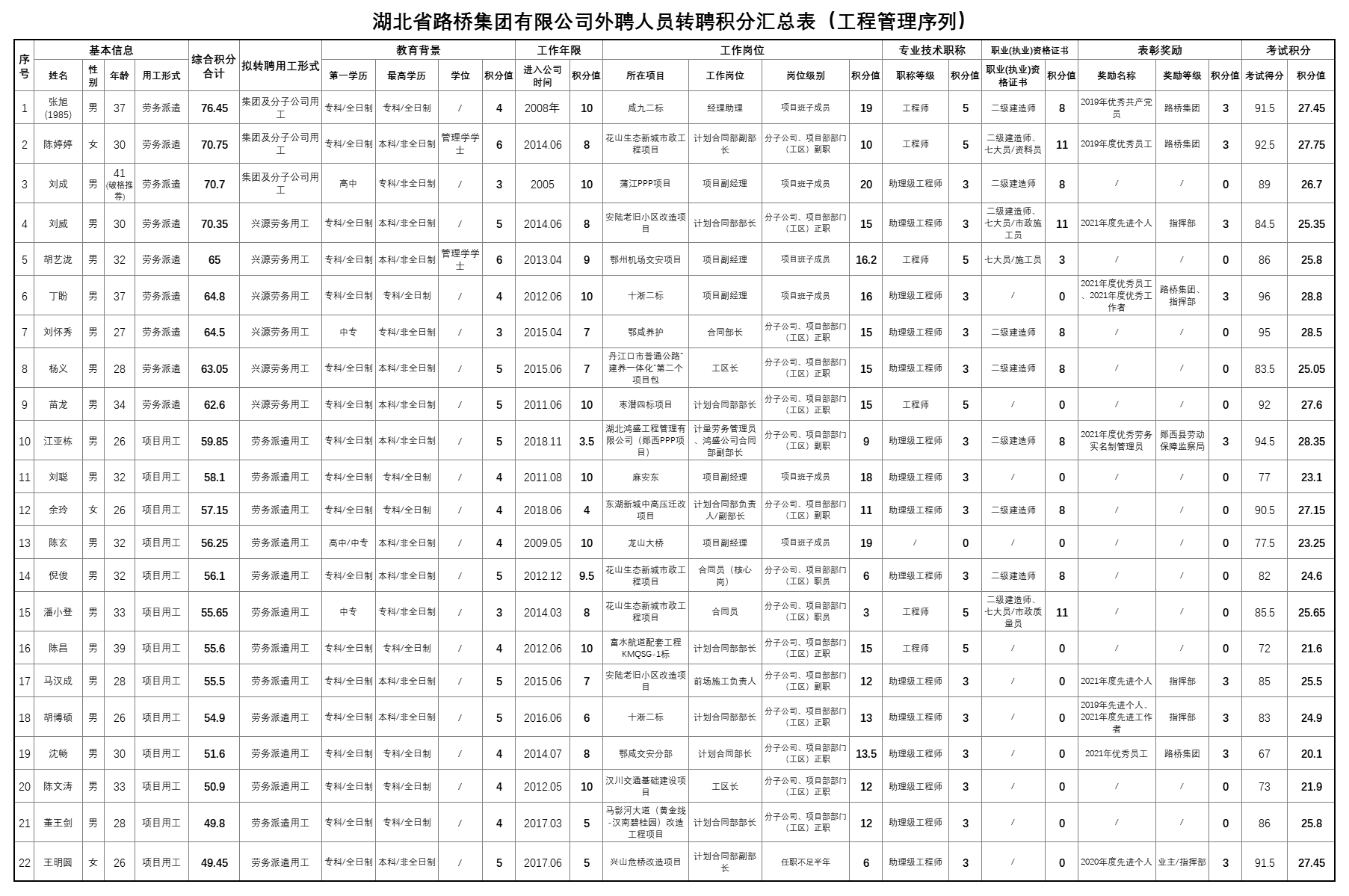 湖北省路橋集團有限公司2022年擬轉聘人員公示