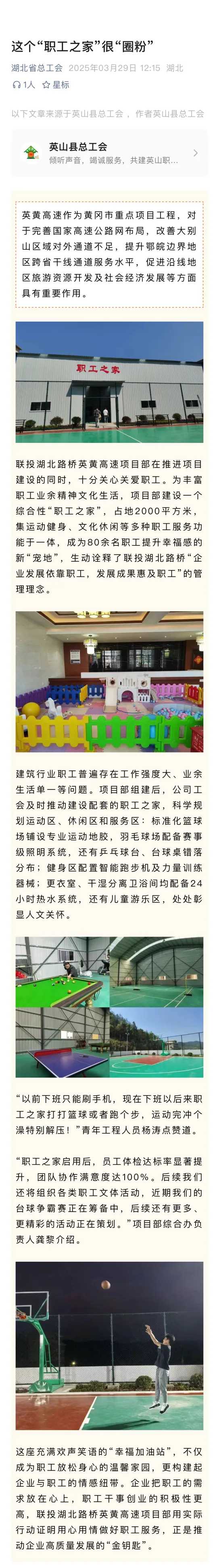 聯投湖北路橋英黃高速項目部在推進項目建設的同時,十分關心關愛職工。為豐富職工業余精神文化生活,項目部建設一個綜合性“職工之家”,占地2000平方米,集運動健身、文化休閑等多種職工服務功能于一體,成為80余名職工提升幸福感的新“寵地”,生動詮釋了聯投湖北路橋“企業發展依靠職工,發展成果惠及職工”的管理理念。近日,湖北省總工會進行深入報道,全文如下: