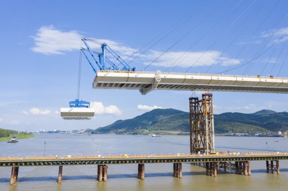 依托武穴長江公路大橋項目,針對鋼箱梁架梁過墩的問題,采用分節段承插式臨時墩施工技術,提前施工第一節段的臨時墩,待臨時墩墩頂的梁段架設完成后,再利用鋼箱梁梁面布置的液壓千斤頂和鋼絞線提升第二節段到設計標高,為主梁架設過墩預留操作空間。結合施工工藝、監控量測和成橋受力情況,在雙懸臂施工狀態下,創新性地在臨時墩與鋼箱梁之間采用軟連接設計。軟連接采用柔性吊帶穿過耳板連接,能夠快速地鎖定及解除,避免對結構產生擾動,現場可操作性強。在主梁架設懸臂施工全周期方面具有良好的穩定性、安全性和抗風性,對于斜拉橋主梁懸臂施工條件下的臨時墩設置有一定的借鑒作用,具有較好的應用效果及推廣應用前景。
