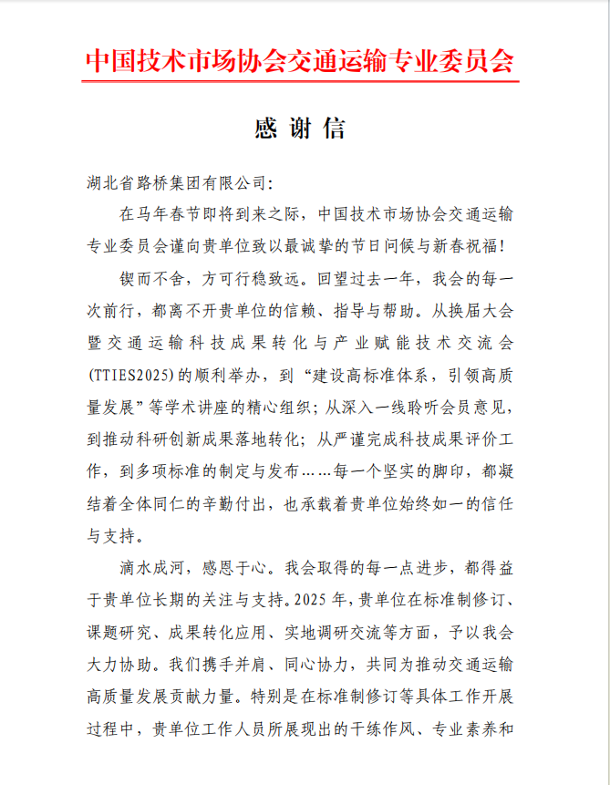 近日,湖北路橋收到中國技術(shù)市場協(xié)會(huì)交通運(yùn)輸專業(yè)委員會(huì)(簡稱“中技協(xié)交專委會(huì)”)寄來的感謝信,對(duì)公司科學(xué)技術(shù)質(zhì)量部在各項(xiàng)工作中的大力支持表示感謝。