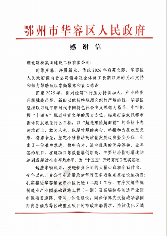 鄂州市華容區(qū)人民政府發(fā)來感謝信,對(duì)湖北省路橋建設(shè)工程有限公司承建的華容區(qū)多項(xiàng)重點(diǎn)基礎(chǔ)設(shè)施項(xiàng)目的高質(zhì)量推進(jìn)給予高度肯定與誠摯贊譽(yù)。