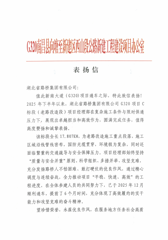 G320南昌縣向塘至新建區(qū)西山段公路新建工程C標(biāo)段(老路改造段)項(xiàng)目收到一封來自南昌市公路事業(yè)發(fā)展中心的表揚(yáng)信,對(duì)項(xiàng)目團(tuán)隊(duì)在復(fù)雜施工環(huán)境與嚴(yán)格的限時(shí)保通雙重壓力之下,提前6個(gè)月完成建設(shè)任務(wù)的非凡勇氣、務(wù)實(shí)作為與堅(jiān)韌擔(dān)當(dāng),給予了高度評(píng)價(jià)與贊美。