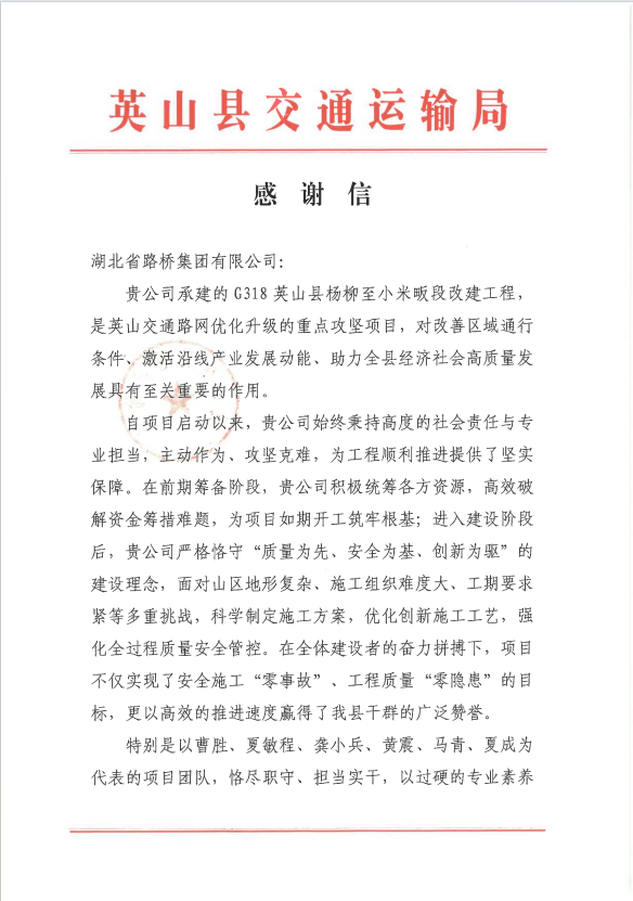 英山縣交通運(yùn)輸局對(duì)湖北路橋承建的G318英山楊柳至小米畈段改建工程給予高度贊譽(yù)。