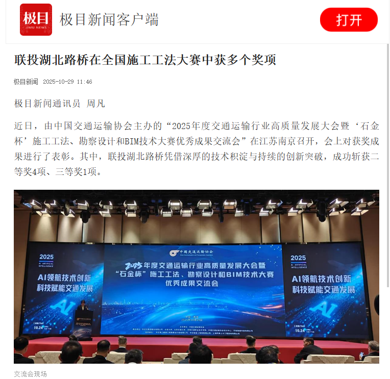 近日,由中國交通運輸協(xié)會主辦的“2025年度交通運輸行業(yè)高質(zhì)量發(fā)展大會暨‘石金杯’施工工法、勘察設(shè)計和BIM技術(shù)大賽優(yōu)秀成果交流會”在江蘇南京召開,聯(lián)投湖北路橋榮獲多個獎項,極目新聞對此事件進(jìn)行報道,以下是報道全文: