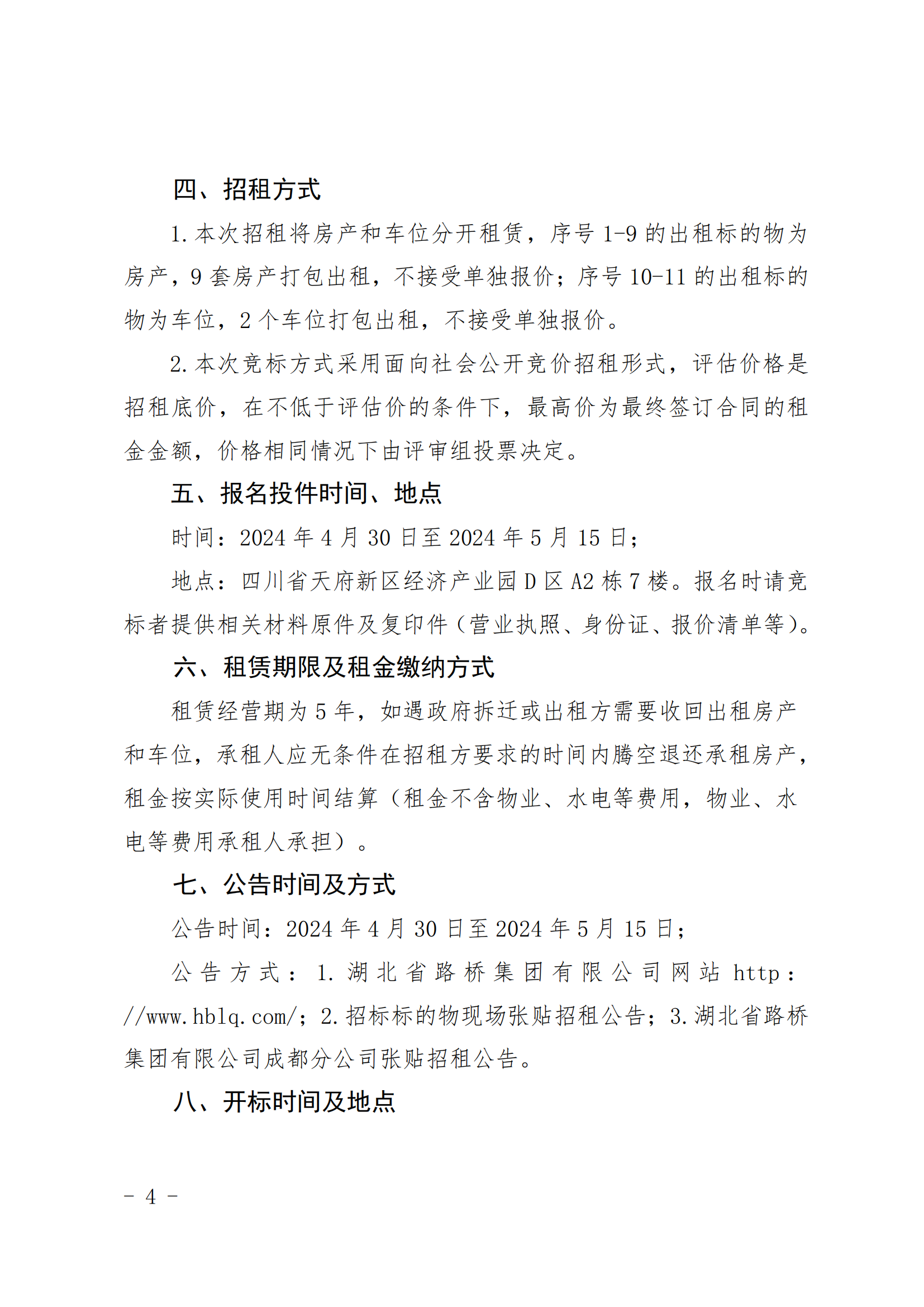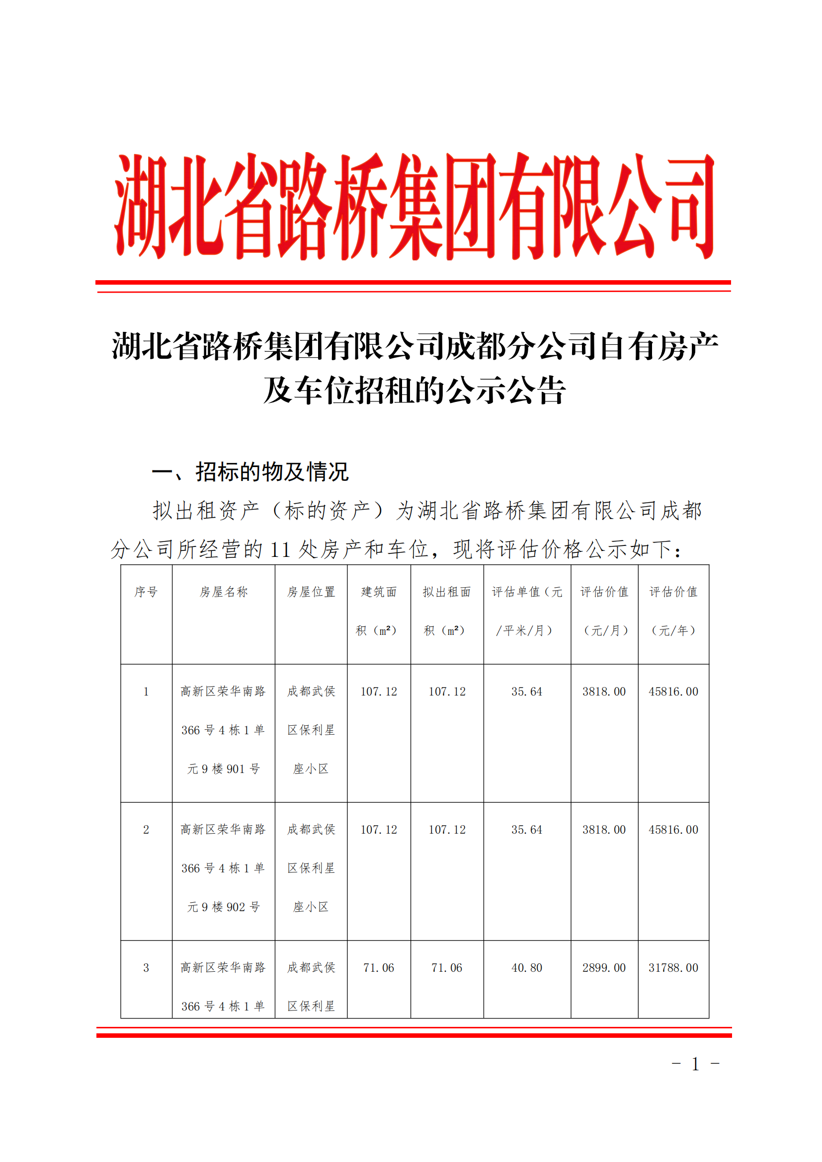 湖北省路橋集團有限公司成都分公司自有房產及車位招租的公示公告